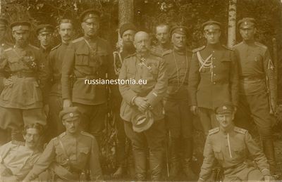 Штаб 1-го стрелкового корпуса, станция Веймарн, 22.07.1919. Ротмистр Аксаков стоит второй слева