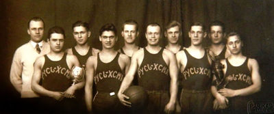 Баскетбольные команды «Русь-ХСМЛ» и «Praha YMCA», 20.01.1932, Прага. Евгений Гайкович четвертый слева во втором ряду