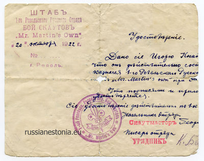 Скаут 1-го Ревельского русского отряда бой-скаутов "Mr. Martin's own". Окончил частную Ревельскую русскую мужскую гимназию общества "Русская школа в Эстонии" (1923)[1].