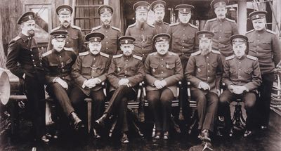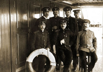 Офицеры ледокольных транспортов «Таймыр» и «Вайгач», 1913. В. Нилендер сидит первый справа
