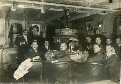 Кают-компания крейсера «Баян», 11.03.1915. Мичман Нотбек сидит во втором ряду четвертый справа (с папиросой)