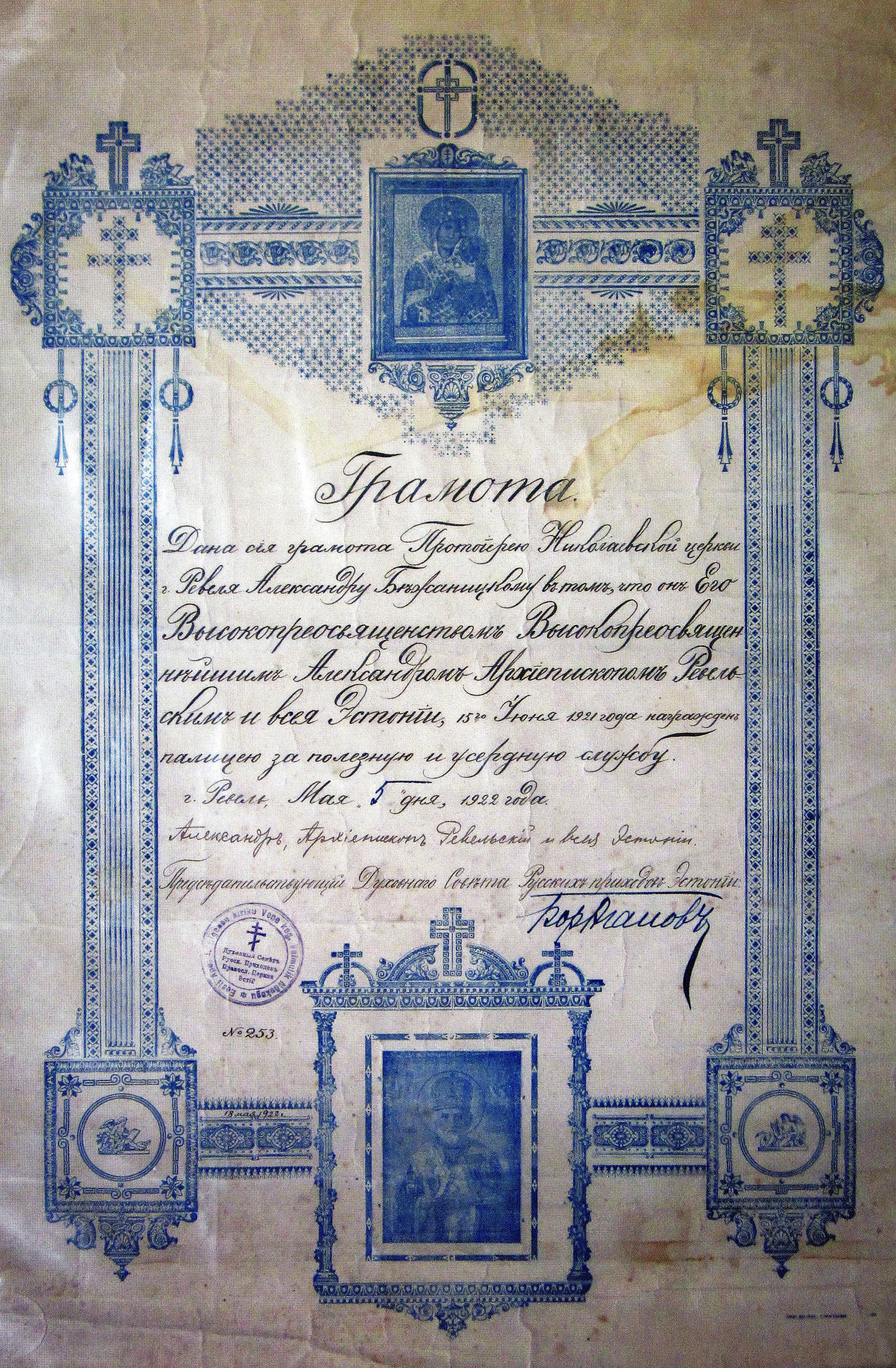 Файл:Грамота протоиерея Александра Бежаницкого о награждении палицей, 5.05.1922.jpg
