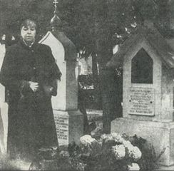 Дочь Рябчикова Александра Матвеевича Елена у его могилы. Франция. Источник: журнал "Вокруг света", №1, 1994.