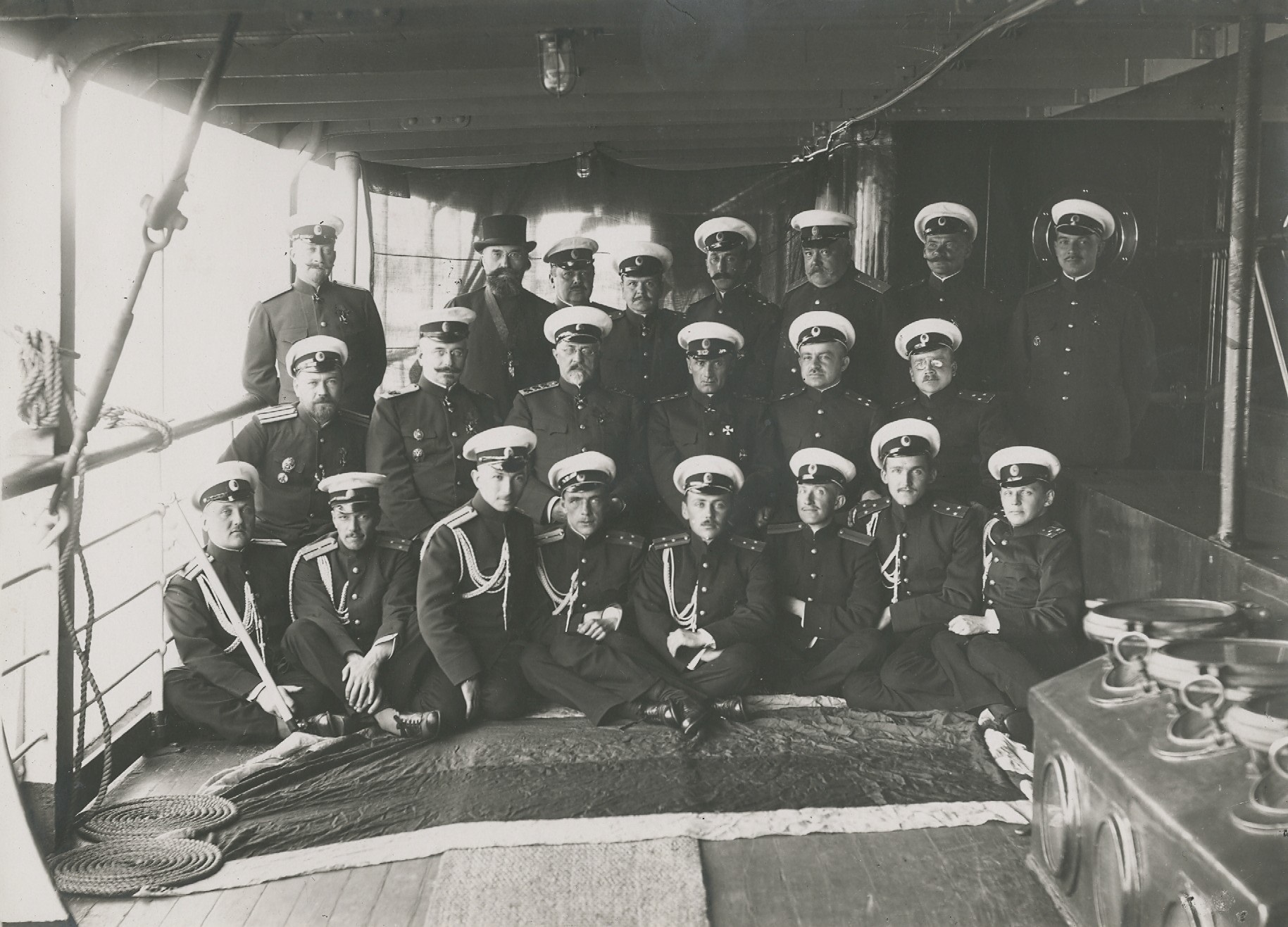 На фото (слева направо, снизу вверх): 1. лейтенант Янкович Владимир Николаевич (и.д. флагманского интенданта); 2. лейтенант Милашевич 2-й Николай Григорьевич (и.д. старшего флаг-офицера по оперативной части); 3. мичман Костенко-Радзейовский Владимир Александрович (флаг-офицер по распорядительной части); 4. инженер-механик лейтенант Голынский Андрей Васильевич (флаг-офицер по распорядительной части); 5. лейтенант Тирбах Петр Игнатьевич (флаг-офицер); 6. старший лейтенант Довконт Федор Юльевич (флагманский историограф); 7. лейтенант Комелов Михаил Михайлович (и.д. старшего флаг-офицера по оперативной части); 8. лейтенант Утин Борис Михайлович (и.д. старшего флаг-офицера по распорядительной части); 9. капитан 1-го ранга Альтфатер Василий Михайлович; 10. контр-адмирал Григоров Николай Митрофанович (начальник штаба); 11. адмирал Канин Василий Александрович (командующий флотом); 12. вице-адмирал Колчак Александр Васильевич; 13. капитан 2-го ранга князь Черкасский Михаил Борисович (и.д. флаг-капитана по оперативной части); 14. капитан 2-го ранга Бубнов 2-й Александр Дмитриевич; 15. капитан 1-го ранга Тимирев Сергей Николаевич (флаг-капитан по распорядительной части); 16. священник; 17. капитан 1-го ранга Игнатьев 2-й Николай Иванович (флагманский артиллерийский офицер); 18. инженер-механик генерал-лейтенант Винтер Виктор Андреевич (флагманский механик); 19. капитан 2-го ранга Сполатбог Александр Николаевич (флагманский штурманский офицер); 20. действительный статский советник Зорт Август Августович (флагманский врач); 21. капитан 2-го ранга барон Мирбах Рудольф Романович (флагманский минный офицер и командир посыльного судна "Кречет"); старший лейтенант Блинов Сергей Павлович (и.д. помощника флаг-капитана по распорядительной части).