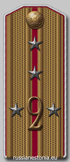 - Погоны: Малиновые с белыми кантами и цифрой "2". У офицеров золотые с малиновым просветом и белыми кантами.